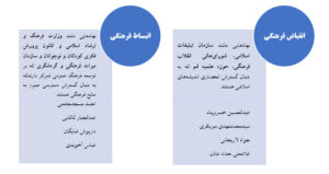 برای درک بهتر دوگانههای فرهنگی کشور لازم است تا معرفی اجمالی از جریانها و افراد مؤثر آنها ارائه شود تا عرصه فرهنگی کشور برای سیاستگذاران فرهنگی کشور تا حدودی روشن شود و در جهت مدیریت این دوگانهها گام بردارند.